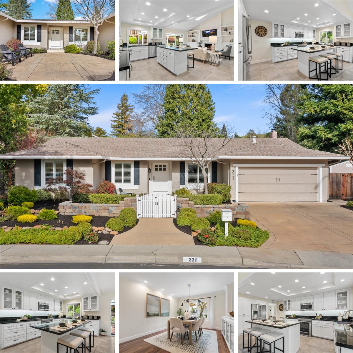 Prime location, single story with no step downs and beautifully updated inside and out. Open floor plan with vaulted ceilings, a chef's kitchen with an island overlooking the family room, white cabinets and stainless steel appliances. Formal dining and living rooms provide that much sought after separate space. Hardwood flooring, custom millwork and plantation shutters. A redesigned master suite includes dual sinks and a large walk in shower. Three generously sized bedrooms share a hall bath with an updated vanity and tub/shower. A private and great entertaining backyard with 3000 sq. ft of stamped concrete patios and an overhead trellis and plenty of room to play. A few blocks to the neighborhood pool and tennis courts and quick access to the elementary, middle schools and Iron Horse Trail. Open Saturday, Sunday 1-4pm